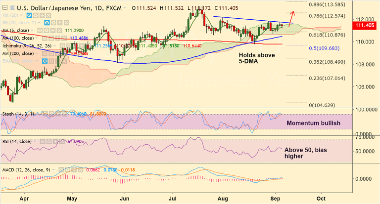 - On the downside, 5-DMA offers immediate support at 111.27, break below eyes 61.8% Fib at 110.87.