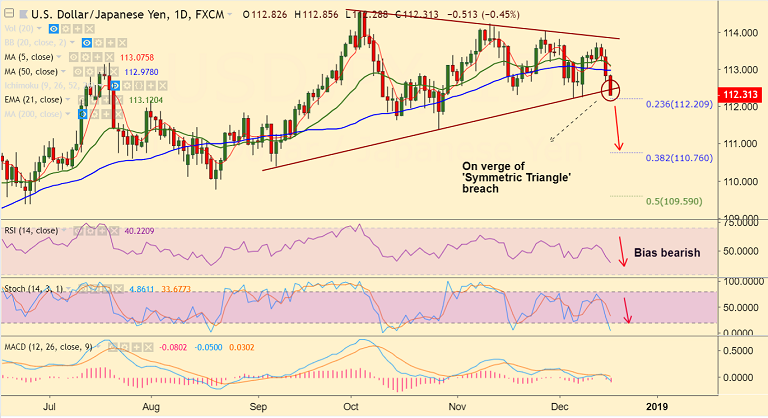 - The pair in on verge of breach at 'Symmetric Triangle' base, on expectations of a dovish Fed.