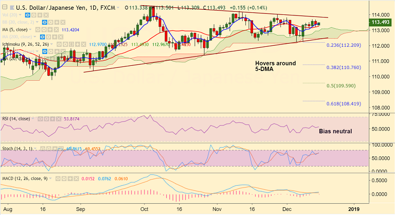 - Immediate support is seen at 20-DMA at 113.25, while major resistance is seen at 113.85 (Major trendline).