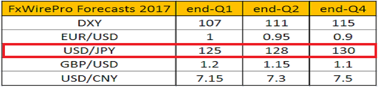 We foresee that the USD/JPY currency pair will test the 130 level towards the end of 2017, for the first time since April 2002. Also, the 10-year Treasury yield spread will likely widen, at over 250 basis points for the first time since 2010.
