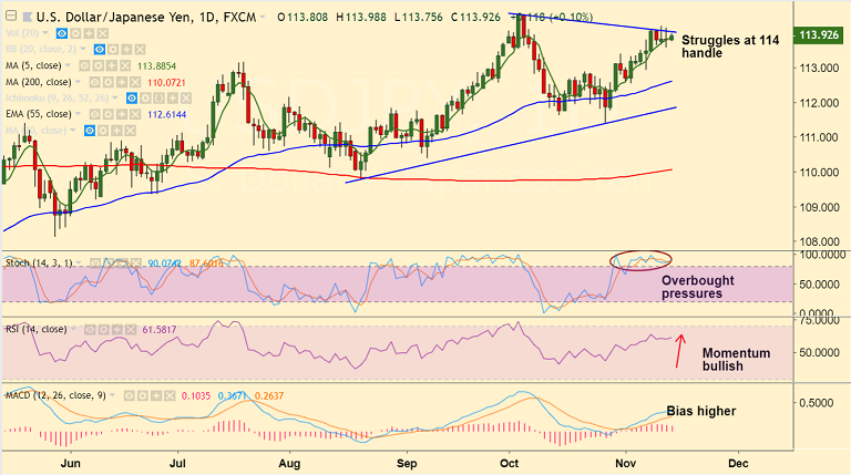 - The pair maintains its positive tone and a decisive break above 114 is likely to see test of 114.55 (Oct 4 high) ahead of 114.74 (Nov 2017 high).