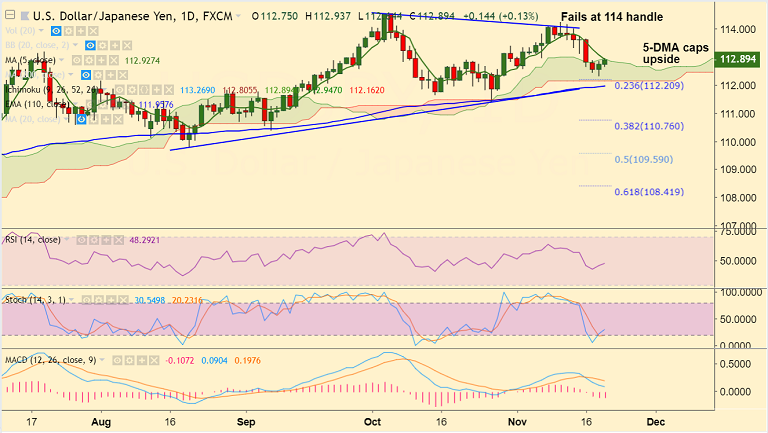 - On the flipside, the pair finds immediate support at 55-EMA at 112.65, break below to see weakness till 110-EMA at 111.95.