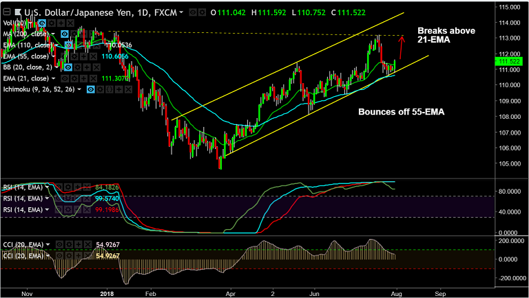 Support levels - 111.29 (21-EMA), 110.87 (61.8% Fib), 110.60 (55-EMA)