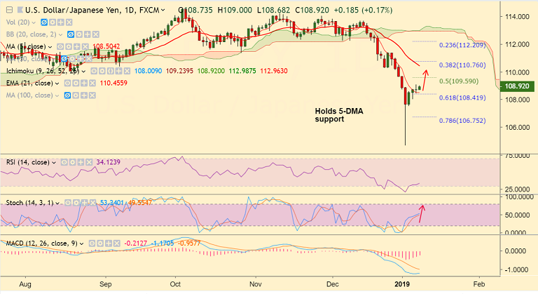 - On the flipside, break below immediate support at 5-DMA (108.50) will see resumption of weakness.