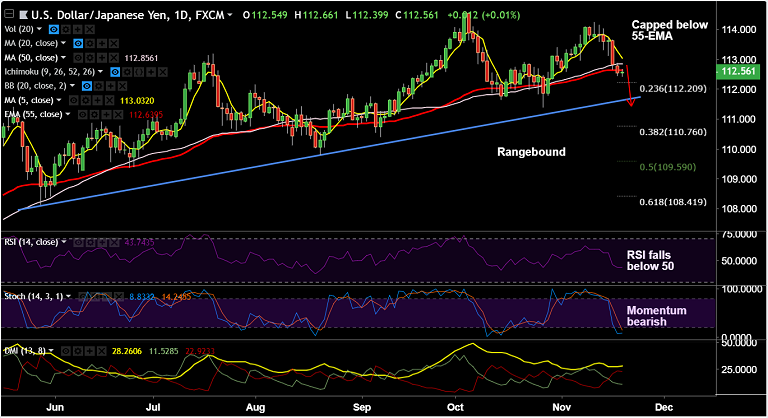 Resistance levels - 112.63 (55-EMA), 112.85 (50-DMA), 113.03 (5-DMA)