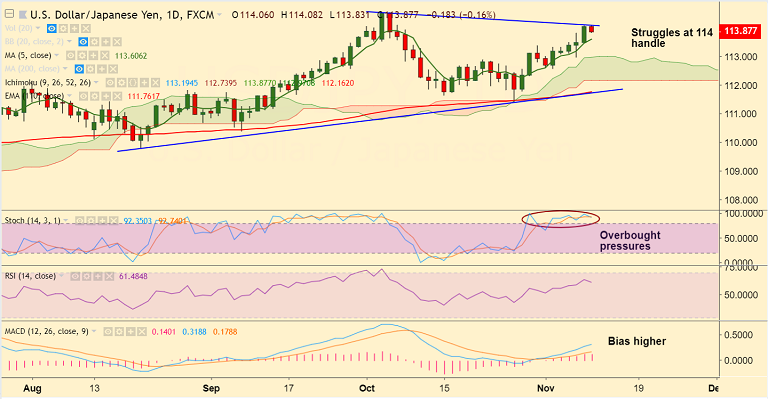 - However, the pair failed to hold gains and is currently trading at 113.89, down 0.14% on the day.