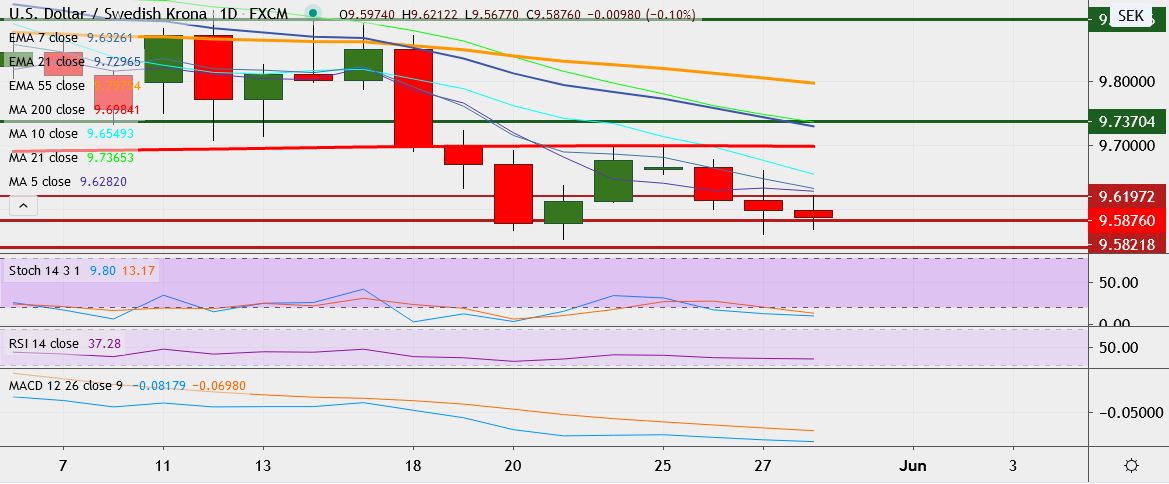 - USD/SEK trades 0.1 percent down at 9.5893, having hit a low of 9.5611 on Wednesday, its lowest since May 21.