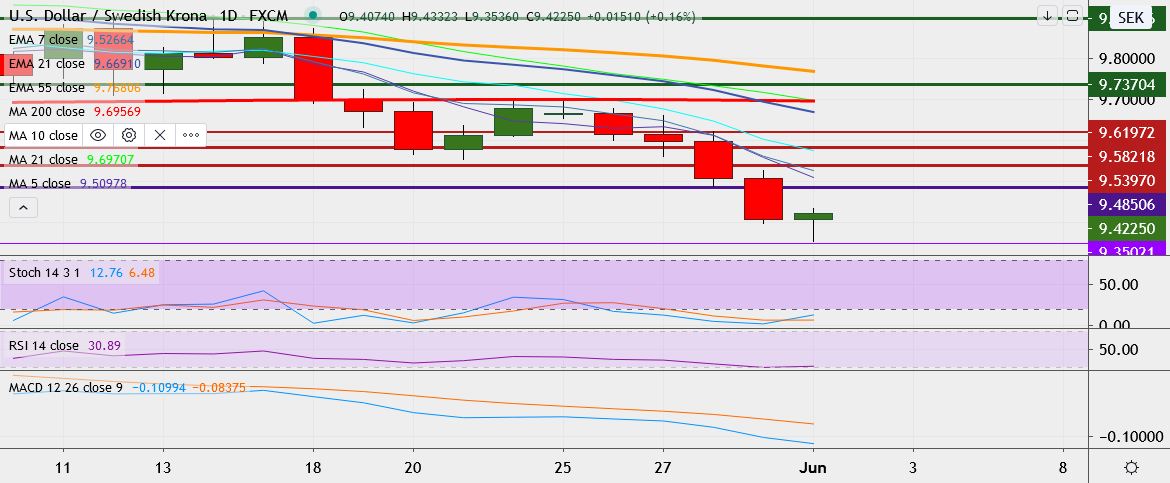 - USD/SEK trades 0.1 percent up at 9.4209, having hit a low of 9.3536 earlier, its lowest since March 9.