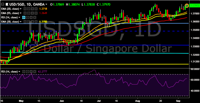 We prefer to take long position on USD/SGD around 1.3690, stop loss at 1.3646 and target of 1.3888.