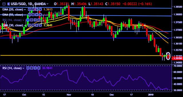 We prefer to take short position on USD/SGD around 1.3525, stop loss at 1.3557 and target of 1.3465/1.3422.