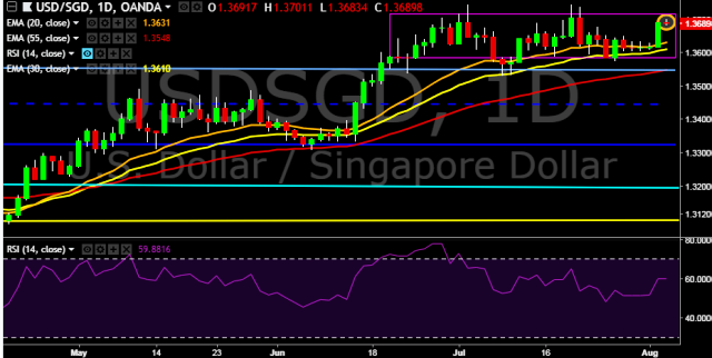 We prefer to take long position on USD/SGD around 1.3685, stop loss at 1.3652 and target of 1.3745/1.3788.