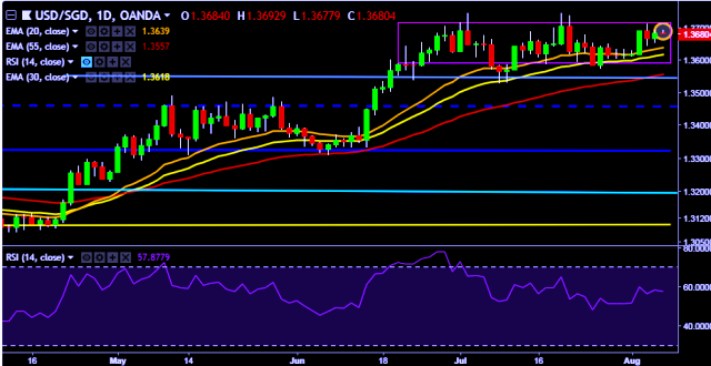 We prefer to take long position on USD/SGD only above 1.3692, stop loss at 1.3652 and target of 1.3745/1.3788.