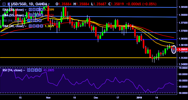 We prefer to take short position on USD/SGD around 1.3585, stop loss at 1.3620 and target of 1.3538.