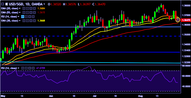- USD/SGD is currently trading around 1.3651 marks.