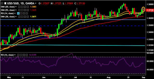 - USD/SGD is currently trading around 1.3715 marks.