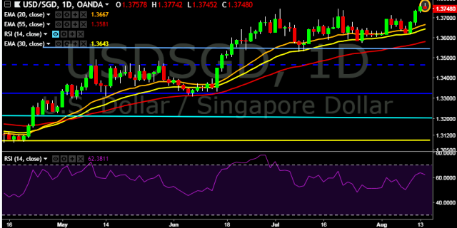 We prefer to take long position on USD/SGD only above 1.3774, stop loss at 1.3720 and target of 1.3820 mark.