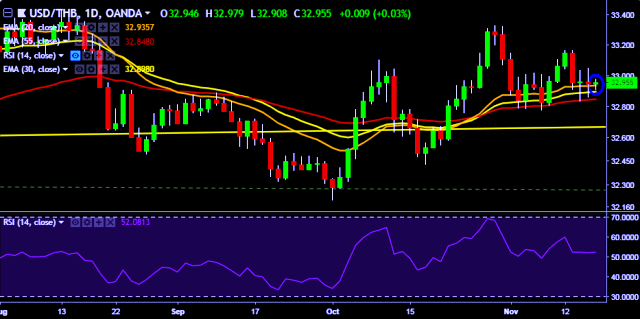 We prefer to take long position on USD/THB only above 33.02, stop loss 32.80 and target of 33.52.