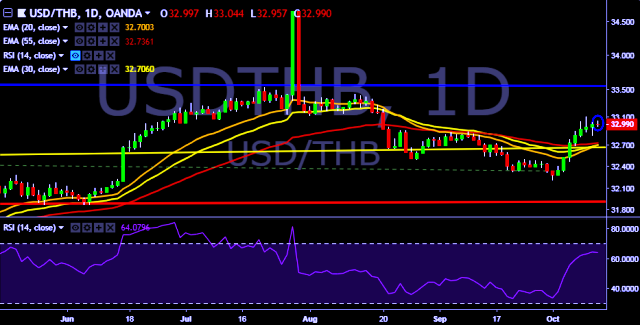 We prefer to take long position on USD/THB only above 33.05, stop loss 32.81 and target of 33.20/33.37.