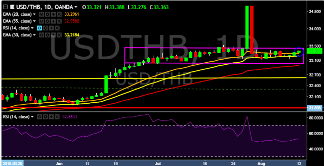 We prefer to take long position on USD/THB only above 33.52, stop loss at 33.22 and target of 33.96.