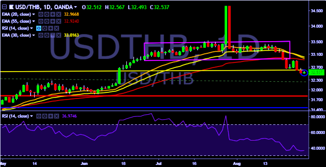 We prefer to take short position on USD/THB around 32.55, stop loss at 32.67 and target of 32.18.