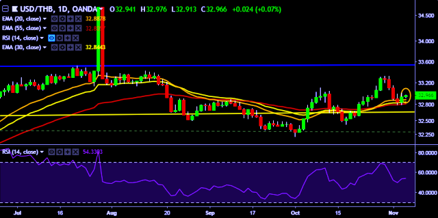 We prefer to take long position on USD/THB only above 33.02, stop loss 32.70 and target of 33.15.