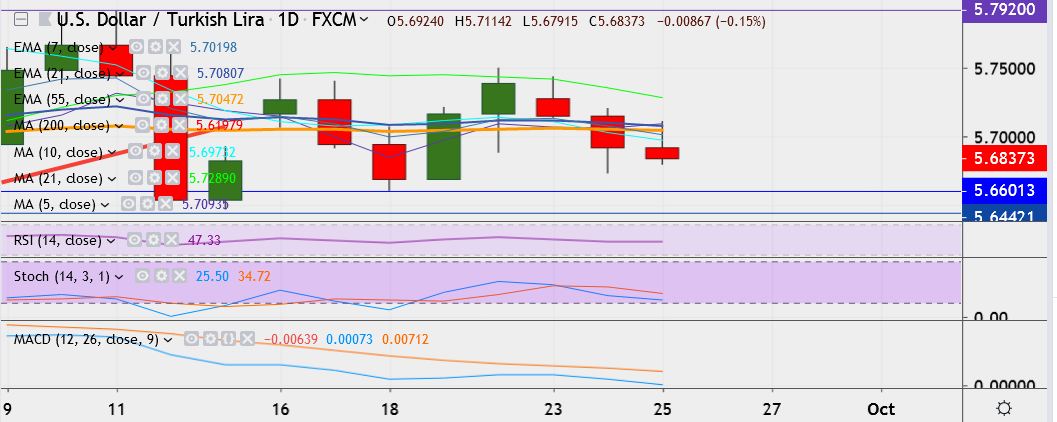 - On the downside, support is seen at 5.6600 (September 18 Low), and break below could take it near 5.6468.