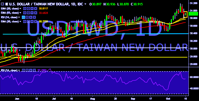 We prefer to take long position on USD/TWD only above 31.05, stop loss at 30.70 and target of 31.42.