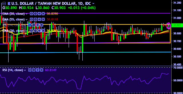 We prefer to take long position on USD/TWD only above 30.92, stop loss at 30.68 and target of 31.18.