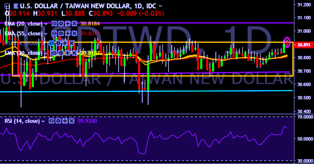 We prefer to take long position on USD/TWD around 30.80, stop loss at 30.68 and target of 31.18.
