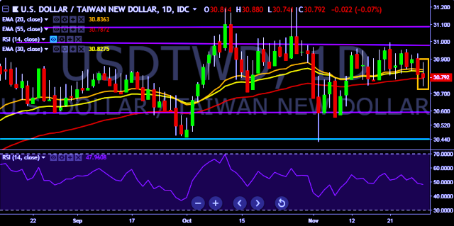 We prefer to take short position on USD/TWD around 30.80, stop loss at 30.99 and target of 30.56.