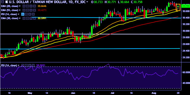 We prefer to take short position on USD/TWD around 30.75, stop loss at 30.90 and target of 30.47.