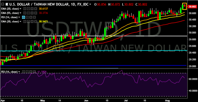 We prefer to take long position on USD/TWD only above 30.90, stop loss at 30.70 and target of 31.17.