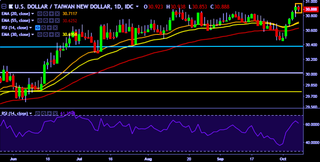 We prefer to take long position on USD/TWD only above 30.95, stop loss at 30.70 and target of 31.42.