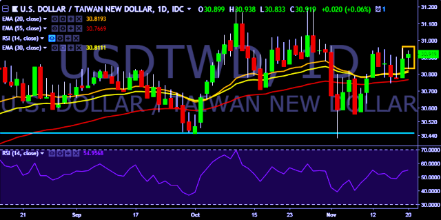We prefer to take long position on USD/TWD only above 30.95, stop loss at 30.70 and target of 31.04/31.18/31.42.