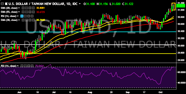 We prefer to take long position on USD/TWD around 31.06, stop loss at 30.70 and target of 31.42.