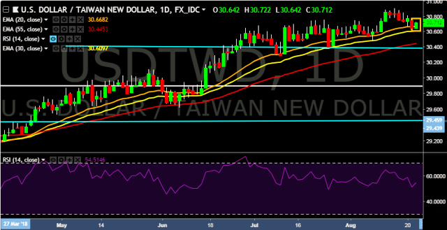 We prefer to take long position on USD/TWD around 30.67, stop loss at 30.60 and target of 30.90.