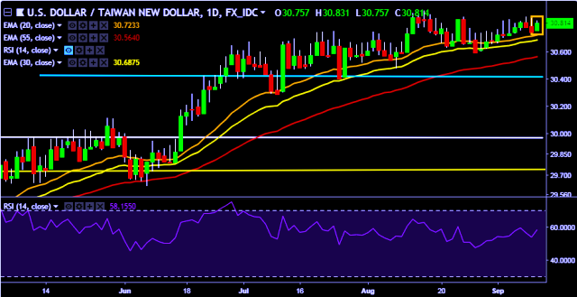 We prefer to take long position on USD/TWD only above 30.90, stop loss at 30.60 and target of 31.17.