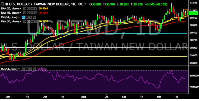 We prefer to take long position on USD/TWD only above 31.02, stop loss at 30.70 and target of 31.42.