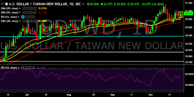 We prefer to take long position on USD/TWD only above 31.02, stop loss at 30.70 and target of 31.42.