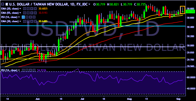 We prefer to take long position on USD/TWD only above 30.90, stop loss at 30.60 and target of 31.17.