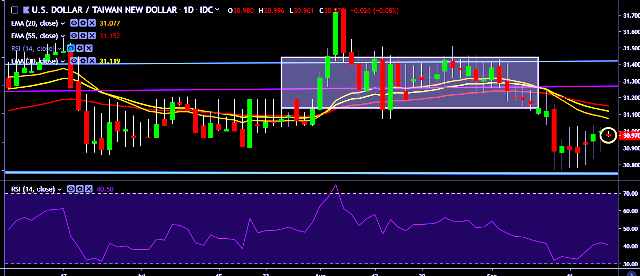 We prefer to take short position on USD/TWD only below 30.87, stop loss at 31.10 and target of 30.54.