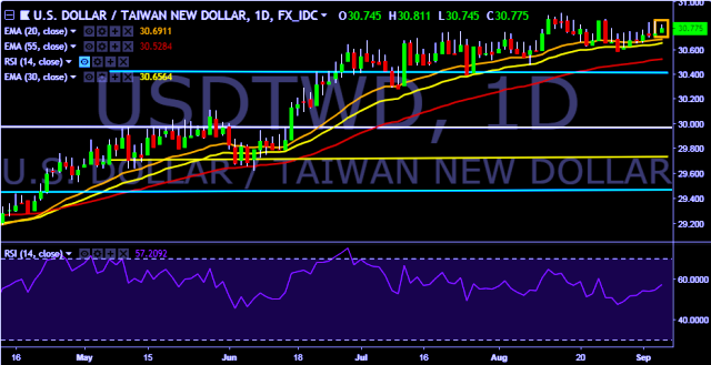 We prefer to take long position on USD/TWD only above 30.90, stop loss at 30.60 and target of 31.17.