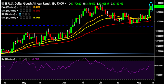 We prefer to take long position on USD/ZAR around 13.80, stop loss 13.50 and target of 13.99/14.28.