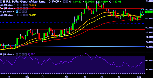 We prefer to take long position on USD/ZAR around 13.47, stop loss 13.22 and target of 13.70.