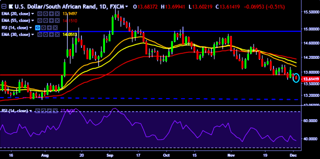 We prefer to take short position on USD/ZAR only below 13.57, stop loss at 13.94 and target of 13.40/13.27.