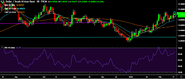 We prefer to take long position on USD/ZAR around 15.00, stop loss at 14.94 and target of 15.22/15.40.
