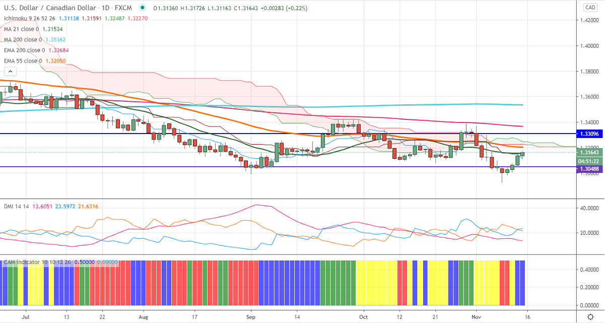 USDCAD is trading higher for the fourth consecutive days and jumped more than 250 pips on broad-based US dollar buying. US PPI came at 0.3% in Oct compared to September's 0.4%. DXY is facing strong resistance at 21-day MA at 93.20, any violation above targets 94. Loonie hits an intraday high of 1.31726 and currently trading around 1.31649.