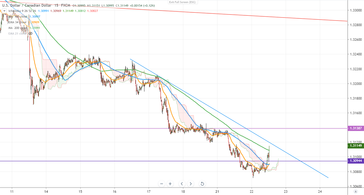 USDCAD trades slightly higher after more than 1-week of weakness. The pair hit low of 1.30710 and shown a minor recovery. The broad-based USD selling and easing US-China trade talks is supporting the Canadian dollar.