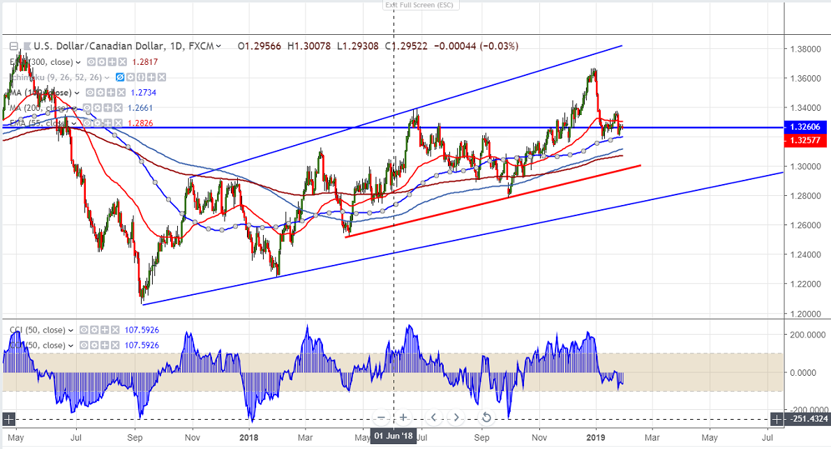 Loonie is consolidating for past three trading session after hitting low of 1.32032 on Jan 28th 2019. Markets eye progress in US China trade talks and Fed monetary policy for further direction.US Fed is expected to pause rate hike for this year. According to CME Fed watch tool shows that probability of Fed to keep rates unchanged is 99.5% for month of Jan, 94.3% for 20th Mar 2019 and 88.7% for May 1st 2019 Fed meeting. The pair hits high of 1.32860 and is currently trading around 1.32569.