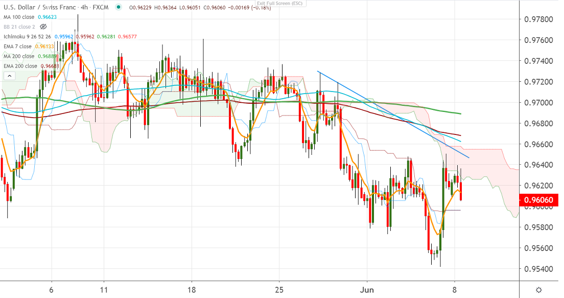 In the 4-hour chart, the pair is holding well below 100 and 200 MA (0.96636/0.96894). The near term support is around 0.9600, the violation below will take the pair till 0.9570/0.9540. Significant selling can be seen below 0.9540